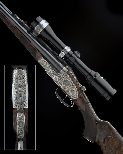 25in. blued nitro barrels with raised sight rib with bright steel finish, finely engraved open sights with folding leaf sight, and ramp-mounted bead fore-sight with flip-up moonsight, the breech end mounted with a Zeiss Diavari-C 3-9x36 T* telescopic sight in exquisitely engraved bright steel finish quickly-detachable mounts, the rib signed by the maker, the breech end with floral and scroll flourishes, treble-grip action with hidden third bite, side-bolsters, finely carved serpentine fences, removable striker discs, elongated top strap, automatic safety, gold-inlaid cocking-indicators, articulated front trigger, the action, lockplates and furniture exquisitely engraved with tight acanthus scrollwork and floral bouquets and with fine gold highlighting, the fore-end decorated en suite, the left lockplate signed 'W. GLANZNIG' in a scrolling banner, the triggerplate signed 'J. Deflorian', 14 1/2in. highly-figured pistolgrip stock with fluted grip, cheekpiece, finely engraved steel pistolgrip-cap and sling swivels, including 1/2in. rubber recoil pad, fore-end with Deeley & Edge patent release catch, weight 10lb. 2oz., in its brass-cornered oak and leather case, with 'passport' signed by the maker