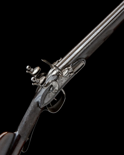 French, circa 1780, with 33 1/2in. barrels, the top-rib with traces of a gold inlaid signature at breech-end, curved and radiused lockplated with raised carved detail and signed ' UIMPER' on the left lock and 'ADOUCE'' on the right, walnut chequered half-stock with swollen comb, iron heel-plate with carved borders, raised trigger-guard tang and pillar-fronted iron trigger-guard bow, bone-tipped replacement ramrod and fitted with swivels