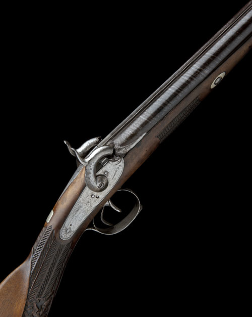 Continental, circa 1860, with twist 34in. barrels, engraved breech-end and top-tang, plain curving back-action locks with engraved tails (brushed bright), walnut half-stock with herring-bone chequering to the wrist and fore-end, the grip finely carved as a boars-head, raised cheek-piece, iron furniture and replacement ramrod