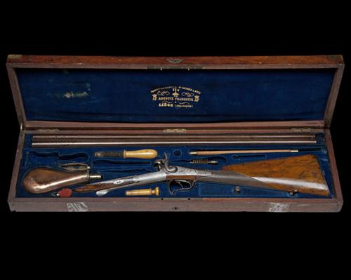 circa 1860, with re-browned stub-twist damascus barrels, the top-rib etched 'A. FRANCOTTE BTE', further etched scrolls at breech-end, relief etched geometric decoration to top-tang and action body, en-suite back-action lockplates with central game-scenes (rubbed), chequered walnut butt-stock, iron heel-plate etched ensuite with the action, smooth splinter fore-end with similarly etched opening lever, etched bottom tang and trigger-guard bow, fitted for sling TOGETHER WITH its walnut storage case, compartmented in the Continental style and lined in blue velvet, the inner lid with makers details in gold-blocked letters and retaining some accessories including a flask and cleaning tools