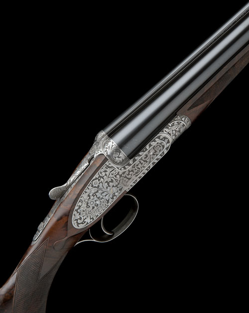 29 1/2in. nitro chopperlump barrels, the rib engraved 'FERLIB. MARCHENO. ITALY.', 3in. chambers, bored approx. imp. cyl. and 1/4 choke, automatic safety with gold-inlaid 'S' detail, gold-inlaid cocking indicators, the action, lockplates and furniture profusely carved in relief with bold acanthus scroll set against a matt background, the triggerplate signed 'Creative Art', old silver finish, 14 1/2in. figured semi-pistolgrip stock cast on for a left-hander, weight 6lb., in its makers brass-cornered oak and leather case