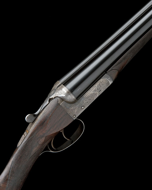 26in. nitro barrels, the tubes engraved 'WEBLEY & SCOTT LTD. LONDON & BIRMINGHAM.' and the rib with a flash of scroll engraving at the breech end, 2 1/2in. chambers, bored approx. imp. cyl. and 1/2 choke, treble-grip action with removable striker discs, automatic safety with gold-inlaid 'SAFE' detail, fine border and acanthus scroll engraving, retaining some original colour-hardening and finish, 13in. stock including buttplate, weight 5lb. 6oz., with a green canvas slip