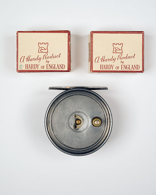 HARDY "PATENT UNIQUA" FLY REEL SIZE 3 3/8 INCH, made by Hardy Bros. England , along with two Hardy boxes containing flies