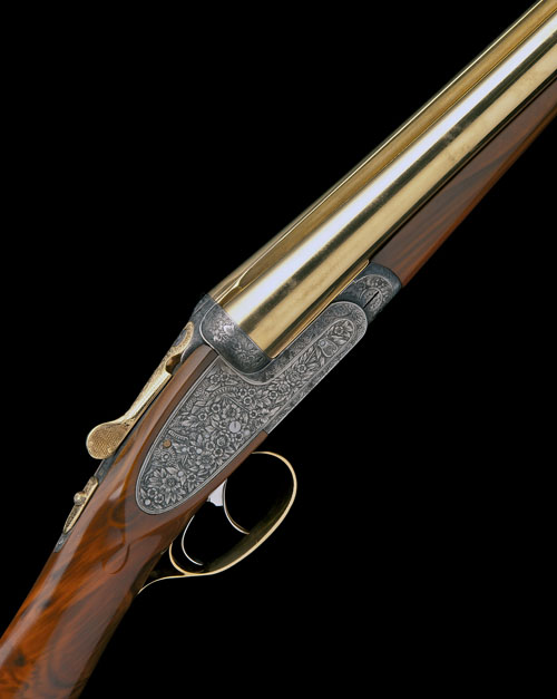 25in. nitro chopperlump barrels with 22 carat gold-plated finish, matt Churchill-rib, 2 1/2in. chambers, bored approx imp. cyl. and 1/2 choke, toplever, automatic safety, lockplate release and rolled-edge triggerguard with gold-plated finish, gold-inlaid cocking-indicators, removable striker discs, articulated front trigger, 14 1/2in. wood stock and fore-end wood with custom gloss coated finish, weight 6lb. 10oz.