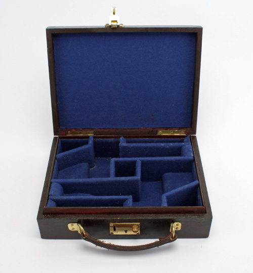 A MODERN TRAVELLING PERCUSSION PISTOL CASE, wooden box boxed interior to hold a pair of travelling percussion pistols (internal measurements approx. 10 /14in. x 7 1/4in.), lined with blue baize, brass fittings