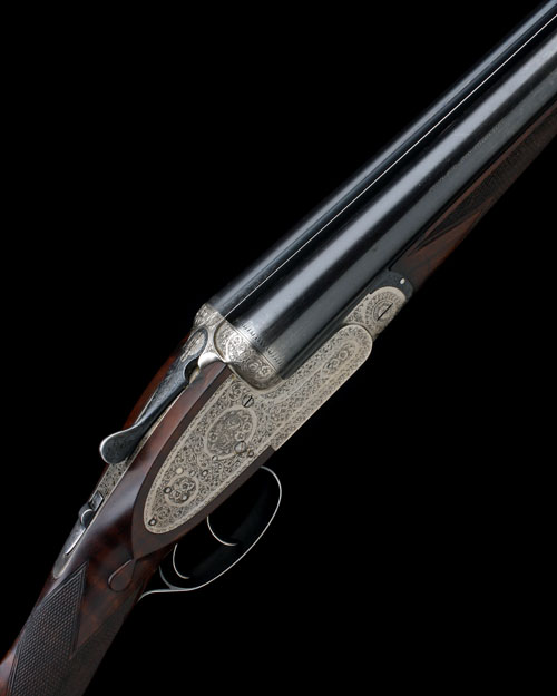 28in. nitro reproved barrels, 2 3/4in. chambers, bored approx. 1/4 and 1/2 choke, carved fences, automatic safety, gold-inlaid cocking-indicators, bouquet and scroll engraving, the underside with the makers name, bright and blued finish overall, 15in. figured stock, weight 6lb. 11oz.