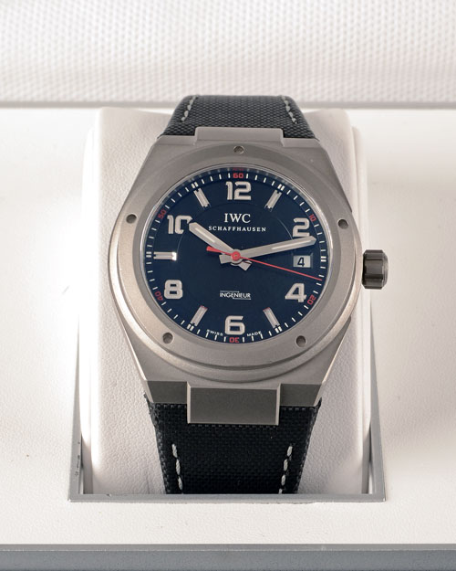recent, with 28 jewel self-winding movement, black dial with alternating Arabic and index hour markers, minute markers around the outer rim, luminescent hands and markers, date window at '3' , sapphire crystal, titanium case with screw-down crown, back with Mercedes-AMG and IWC engraving, nylon strap with deployant clasp, case, dial and movement signed, the whole appearing little used