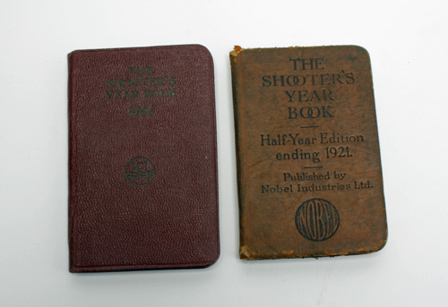 TWO SHOOTER'S YEAR BOOKS ONCE THE PROPERTY OF ROBERT CHURCHILL, NEPHEW OF EJ CHURCHILL, a) 1921 July-December edition of SHOOTER'S YEAR BOOK by Nobel with interesting information for shooters including an extract from the FIREARMS ACT of 1920 and
