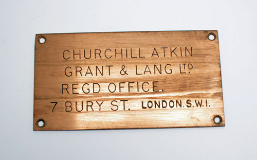 HEAVY COPPER NAME PLATE (7 ½ IN X 4 IN) FOR CHURCHILL ATKIN GRANT & LANG LTD, REGD OFFICE: 7, BURY ST., LONDON, SW1