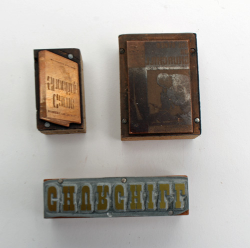 THREE PRINTING BLOCKS FROM THE 1960S ADVERTISING THE NAME OF CHURCHILL, AND THE BOOKS THE OTHER MR CHURCHILL AND GAME SHOOTING...