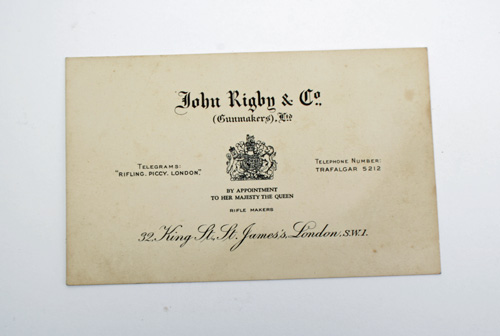 LATE 1950S PAPER GUNCASE LABEL FOR JOHN RIGBY & CO (GUNMAKERS) LTD, 32 King St, St James's London, SW1 (6 in x 3 3/4 in) with the British royal crest and "BY APPOINTMENT TO HER MAJESTY THE QUEEN - Rifle Makers".