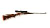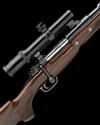 23 3/4in. nitro barrel with open sights and folding leaf sight, ramp-mounted bead fore-sight with flip-up moonsight, protector hood, the receiver (with thumb cutout) mounted with a Swarovski 1,25-4x24 Habicht telescopic sight in quickly-detachable mounts, receiver retaining Brazilian contract markings, recoil blocks, extended magazine with push-button release, finely engraved with acanthus scrollwork surrounding a scene of a lion with kill, signed 'Alberdi', bolt knob carved in high relief with ornate leaf motifs, well-figured pistolgrip stock with cheekpiece, engraved steel pistolgrip-cap (with trap) , sling eyes, horn finial, 14 1/2in. pull including 3/4in. rubber recoil pad