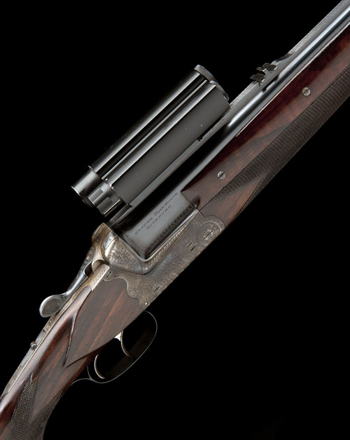 25 3/4in. nitro barrels with matt rib, rear open-sights, ramp-mounted blade fore-sight, wooden side fillets, the breech end fitted with an Aimpoint sight, scroll-backed treble-grip action with bolsters, manual safety, articulated front trigger, border and partial scroll engraving, the underside engraved 'FRANZ SODIA FERLACH' within a roundel, retaining some original colour-hardening and finish, 14 1/4in. pistolgrip stock with cheekpiece (sling swivels removed), including 3/4in. ventilated rubber recoil pad, weight 10lb. 6oz.