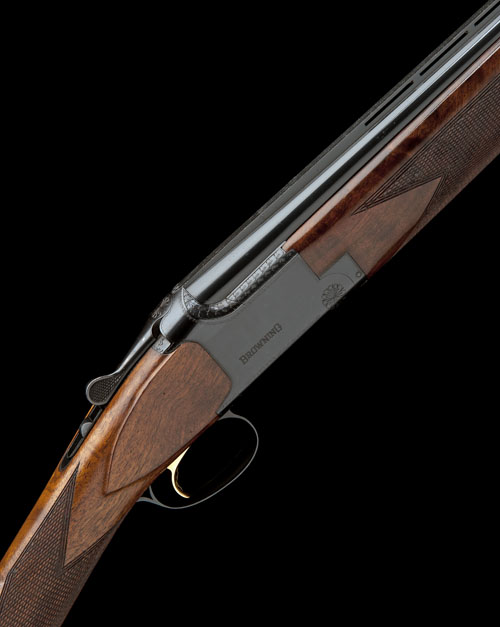 26in. nitro barrels with 6mm ventilated matt top-rib, 2 3/4in. chambers, bored approx. imp. cyl. and 3/4 choke, hold-open toplever, manual safety with integral barrel selector switch, gold-washed single trigger, blacked action with border engraving and 'BROWNING', signed 'L. Ernst', 14 1/4in. figured stock including buttplate, weight 6lb., in its makers canvas and leather case