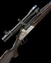25 3/4in. nitro barrels with wooden side fillets, the top barrel engraved '-WAFFEN HUBNER - DARMSTADT -', matt sighting flat with open sights, ramp-mounted bead fore-sight, the breech end fitted with a Zeiss Varipoint VM 1,5-6x42 telescopic sight in rapidly undeployable mounts, treble-grip action with side bolsters, hold-open toplever, automatic safety, gold-washed extractors and triggers, set front trigger, the bolsters and action engraved with acorn and oak leaf motifs, the decorative sideplates carved in relief with brace of running boar in a woodland setting on the right, the left with a barking stag with a doe in attendance in their naturalistic habitat, the underside with a crowing capercaillie perched on a branch overlooking the countryside, old silver finish, 13 1/2in. pistolgrip stock with steel pistolgrip cap engraved with oak leaves and with the initial 'R', sling eyes, cheekpiece, including 1/2in. rubber recoil pad, weight 9lb. 1oz.