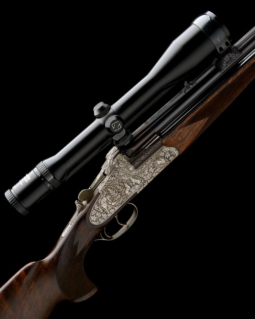 25in. nitro barrels with matt rib, open sights and bead fore-sight, the breech end fitted with a Zeiss Diavari-ZM 2,5-10x48 telescopic sight in quickly-detachable mounts, 3in. shot chamber, bored approx. 3/4 choke, bolstered action with hold-open toplever, shot / ball selector switch, sprung manual cocking lever, cocking-indicators, set front trigger, the action and furniture carved in relief with foliate motifs, hand-detachable lockplates with concealed flush release lever and carved in relief with a fox chasing rabbits on the right, the left with a herd of moose in a woodland setting,14 1/4in. figured hogsback pistolgrip stock with sculpted cheekpiece, sling swivels, including 1/2in. rubber recoil pad, weight 10lb. 5oz.