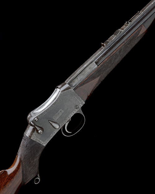 circa 1900, with 28 1/2in. barrel, full-length matted sighting rib signed 'ROBERT HUGHES & SONS, MAKERS LONDON & BIRMINGHAM' within a panel, provision for adjustable dove-tailed fore-sight (missing), 'Africa' style rear-sight with a standing notch, four folding leaves (one absent) and elevating ladder-sight (also missing), machine engraved slab-sided receiver signed 'HUGHES' to both sides, chequered walnut pistol-grip butt-stock, iron furniture (heel-plate replaced in aluminium), the wrist drilled for peep-sight (missing), under-lever with rolled end, chequered splinter fore-end with moulded horn tip and eyelets for sling