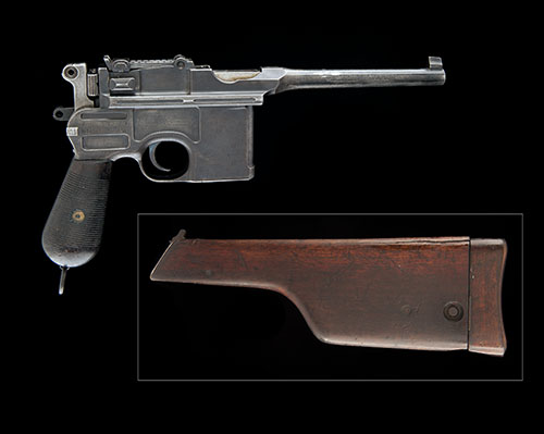 circa 1914, with 5 1/2in. sighted barrel, blued receiver, bolt with short extractor, 1000 metre rear-sight, new-style safety, blued frame, 32 groove walnut bag-shaped grips, lanyard ring to heel, much finish remaining COMPLETE WITH its matching number shoulder-stock holster (split along top-edge)
