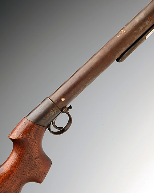 ** A .22 UNDER-LEVER AIR-RIFLE SIGNED BSA, MODEL 'THE BSA AIR-RIFLE (IMPROVED MODEL D)', serial no. 31728, for 1909, with 19 1/2in. sighted barrel, air-chamber with roll-stamped details, amateur replacement stock, spade under-lever, no finish, under-lever catch missing and other minor losses