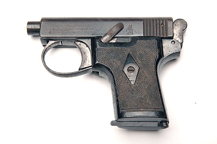 ** A 6.35mm (.25ACP) SEMI-AUTOMATIC VEST-PISTOL SIGNED WEBLEY, MODEL '1907 HAMMER POCKET', serial no. 160418, for 1937 and one of only 29 produced that year, with 2in. barrel, blued slide, blued frame and chequered hard-rubber grips, some staining to finish