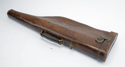 A SINGLE LEATHER LEG-OF-MUTTON GUNCASE, suitable for 30in. barrels, brass lock (key missing)