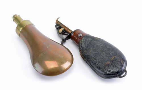 A BRASS POWDER FLASK & A LEATHER SHOT FLASK
