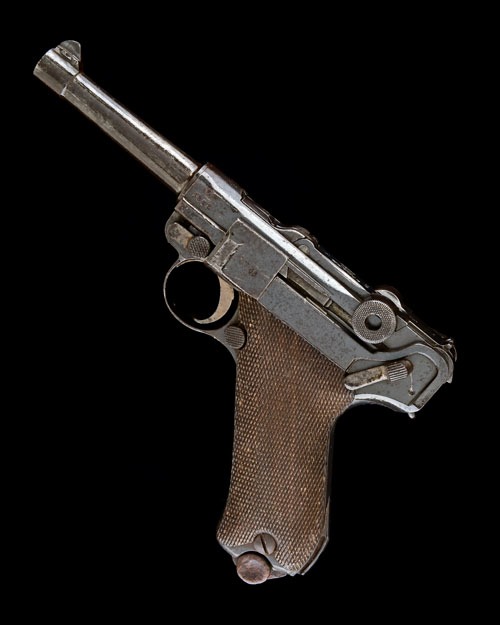 dated for 1916, with blued 4in. barrel, dove-tailed blade fore-sight, notch rear-sight to the rear toggle-link, the top of toggle signed 'ERFURT', blued receiver, blued frame, chequered walnut grips, all matching numbers except magazine (magazine chipped at base), speckled surface corrosion to the original finish, strong traces of 'straw' colour to ancilliaries