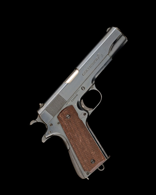 for 1938, with 5in. barrel, blued slide with crescent fore-sight and dove-tailed notch rear-sight, the left hand side of slide stamped with makers address and patent dates to 1913, the right hand side marked 'COLT' together with the calibre and trademark (small loss to blue and extra vertical finger-grooves filed into left hand side of slide), blued frame marked 'GOVERNMENT MODEL', chequered walnut grips and correct magazine with lanyard ring, the whole retaining virtually all its original finish except where noted