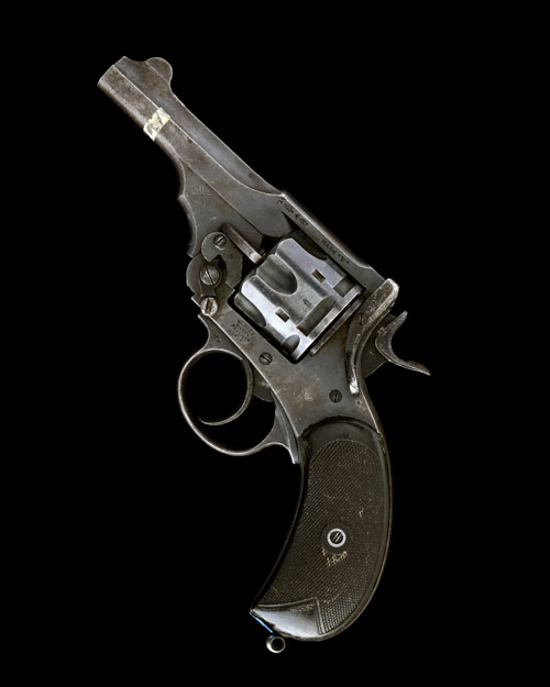 dated for 1915, with 4in. barrel, crescent fore-sight, notch rear-sight to the opening latch, fluted cylinder, break-open frame with automatic ejection, chequered hard-rubber birdshead grips, good traces of original military finish