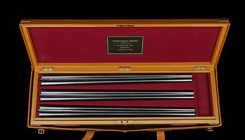 27in. nitro chopperlump barrels, ribs engraved 'DAVID McKAY BROWN (GUNMAKERS) LTD., 32, HAMILTON ROAD, BOTHWELL.' and gold-inlaid '1', '2' and '3', 2 3/4in. chambers, bored approx. imp. cyl. and 1/4 choke in all, J. Dickson 1882 patent treble-grip triggerplate actions, toplevers gold-inlaid '1', '2' and '3', automatic safeties with gold-inlaid 'SAFE' details, the fences finely chiselled in high relief with floral designs on a finely stippled background, the actions and furniture profusely carved with bold stylised acanthus and eriophyllous motifs on a matted background, retaining virtually full original colour-hardening and finish, 15 1/2in. well-figured stocks with semi-diamond grips and including 1in. leather covered recoil pads, weight 6lb. 10oz., in their fine two tiered brass-mounted oak and leather case with lift out barrel tray, full complement of brass, steel and hardwood accessories in a lift-out tray and hide-bound canvas outer