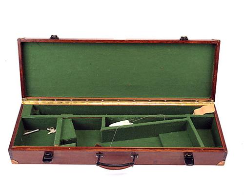 A BRASS-CORNERED WOODEN SINGLE GUNCASE, suitable for 25in. barrels, the interior lined with green baize, two locks (including keys)