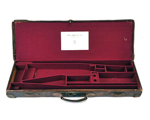 A LEATHER SINGLE WITH CASE WITH PROVISION FOE EXTRA SET OF BARRELS, suitable for 30in. barrels, the interior lined with maroon baize, brass lock (key missing), the lid interior with 'JOHN RIGBY & CO.' trade label
