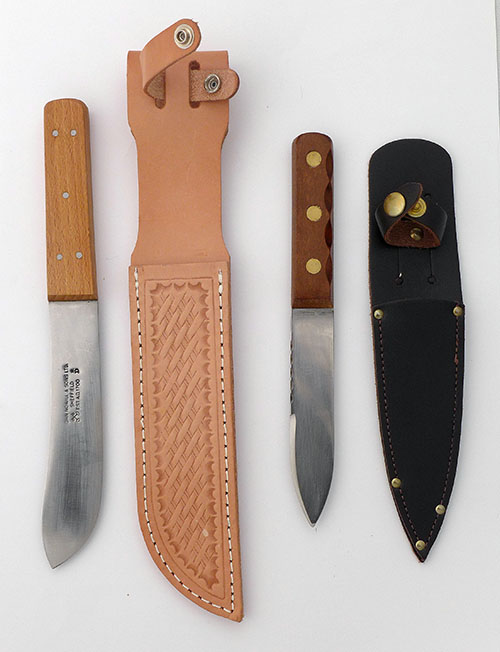 A GREEN-RIVER HUNTING KNIFE AND ANOTHER SIGNED 'NOWILL, SHEFFIELD', the first with spear-point 5in. blade, the second with 6in. bolo blade, both with sheaths
