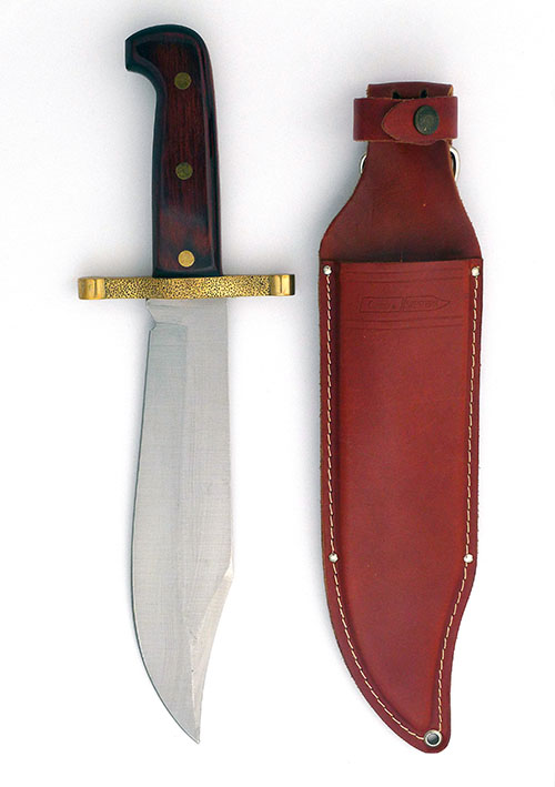 A SUBSTANTIAL BOWIE SIGNED WESTERN USA, model W49, with heavy 9 1/2in. blade, large brass drum-ended cross-guard stippled along the sides and smooth wood hilt with three large brass rivits, complete with its leather sheath