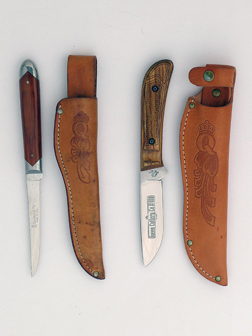TWO SHEATH KNIVES SIGNED QUEENS CUTLERY, USA, TWO GREEN-RIVER STYLE KNIVES,