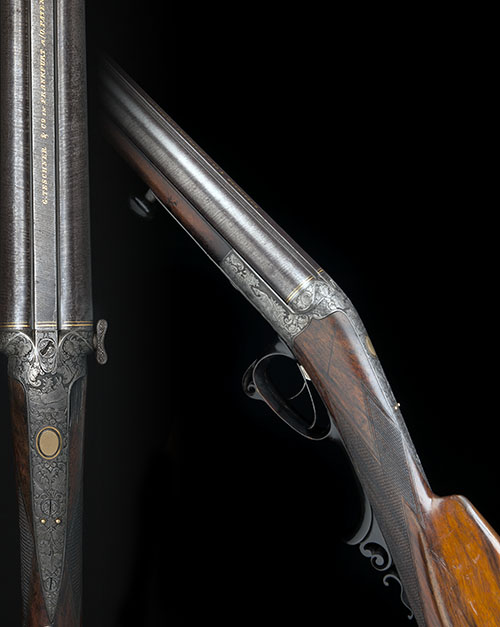 30 7/8in. nitro reproved (in 2013) bold twist barrels with gold line details at the breech end, raised rib gold-inlaid 'G. TESCHNER & CO. IN FRANKFURT A/O. PATENT.', 2 1/2in. chambers, bored approx. true cyl. in both, sling swivel, Collath patent action deeply carved in high relief with game scenes of fox, hare and hound amid scrolling filiciform motifs, all on a matted background, top tang with blank gold oval, gold cocking-indicators, horn and steel lefaucheux-type forward-facing underlever and fixed integral fore-end carved en suite with leaf and shell motifs, bar engraved in script 'No. 1066 Cal. 5', unusual side-mounted manual 'wingnut' safety, scrolled horn triggerguard with scrolling tang forming a pistolgrip, 13 5/8in. figured stock with cheekpiece, chipped at right overhorn, sling button and steel buttplate, weight 6lb. 14oz.