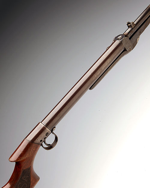 A .22 UNDER-LEVER AIR-RIFLE SIGNED BSA, MODEL STANDARD 'T' PREFIX, serial no. T4712, for 1937, with 19in. sighted barrel, plain air-chamber (no legible etching), walnut saw-gripped butt-stock and push-button under-lever, fair amount of original finish