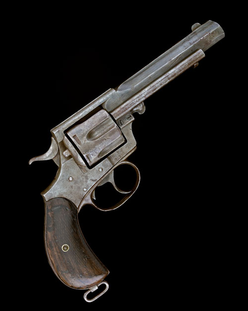 circa 1885, with 5 1/2in. barrel, crescent blade fore-sight, sighting groove to the top-strap, the top-strap signed 'V & R BLAKEMORE, LONDON', fluted cylinder, solid frame with loading gate on the right hand side, smooth walnut birdshead grips with lanyard swivel to base and under-barrel ejector rod, no finish, some mild pitting
