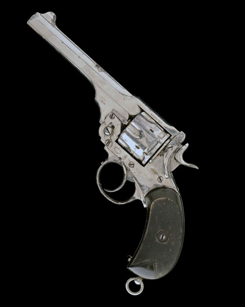 circa 1896, with 6in. barrel, crescent fore-sight, notch rear-sight to the stirrup catch, fluted cylinder, plain break-open frame with automatic ejection, chequered hard-rubber birdshead grips with lanyard ring to base (springs weak, firing pin shortened, plating flaking)