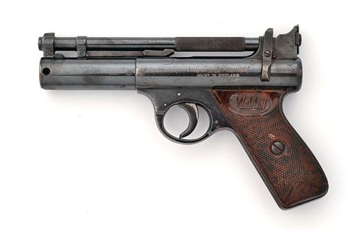 A .177 BARREL-COCKING AIR-PISTOL SIGNED WEBLEY, MODEL 'SENIOR', batch no. 2359, post war circa 1959, with rifled 7in. barrel, adjustable rear-sight, blued air-chamber with makers details and model, brown chequered plastic grips, small losses to finish throughout and missing one end of barrel hinge screw