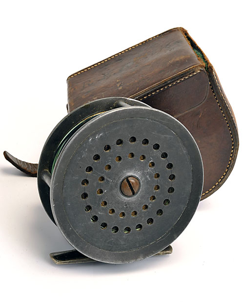 AN ARMY AND NAVY FLY FISHING REEL, made by Army & Navy , 105 Victoria Street, London with leather carry case (lid damaged)