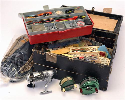 AN ASSORTED BOX OF FISHING TACKLE, including floats, weights, hooks, line, etc