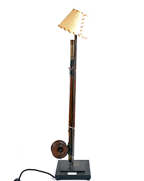 A FISHING THEMED DECORATIVE LAMP, including shade and reel on metal base