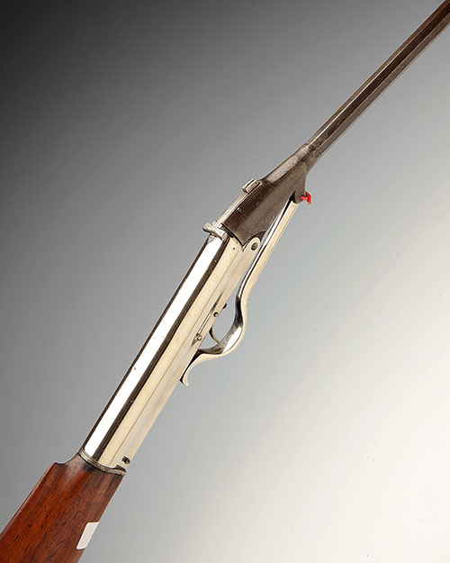 A SCARCE .177 BREAK-BARREL COMBINATION RIMFIRE AIR-RIFLE, UNSIGNED, MODEL 'GEM', no visible serial number, circa 1900, permanently converted to .177 air only, with fixed 18 1/2in. rifled barrel insert, octagonal barrel, re-nickel-plated air-chamber, walnut butt-stock and cocking link forming the trigger-guard (cocking link pin missing)