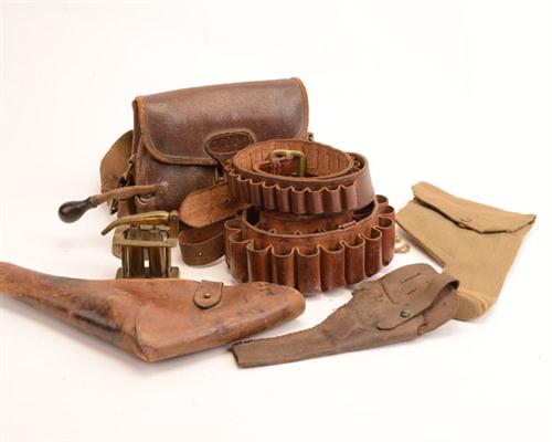 A BOX CONTAINING VARIOUS CARTRIDGE BELTS AND HOLSTERS, including a Leather Cartridge Bag, Leather Holster, Canvas Holster, Small Leather Holster, 12 bore Cartridge Belt, .410 Cartridge Belt and 2 Reloading tools. (8)