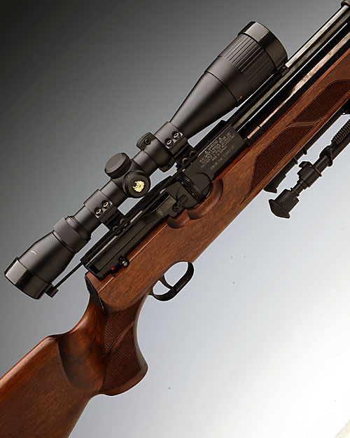 A .22 PRE-CHARGED PNEUMATIC REPEATING AIR-RIFLE SIGNED WEIHRAUCH, MODEL 'HW100 SPORTER', serial no.  1903293, recent, with 23 1/2in. barrel including built-on sound moderator, blued receiver with rotary magazine, detachable air-chamber with gauge and right hand walnut half-stock COMPLETE WITH a 'HARRIS' bipod and a NIKON 4-12x40PA telescopic sight and mounts