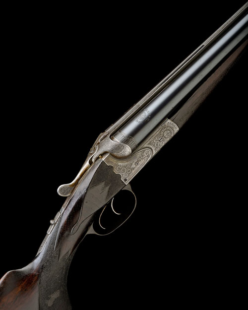 29 1/2in. nitro reproved 'Krupp Stahl' barrels with matt rib, the tubes engraved with a band at the breech end, 2 1/2in. chambers, bored approx. 3/4 choke in both, scroll back treble-grip action with sideclips, cocking indicators, automatic safety with inlaid 'S' detail, horn triggerguard, border and acanthus scroll engraving, 13 3/4in. figured pistolgrip stock chequered at the head, pistolgrip-cap, sculpted cheekpiece, including buttplate, weight 6lb. 9oz.