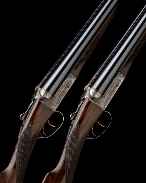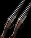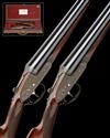 28in. nitro barrels, ribs gold-inlaid '1' and '2', tubes engraved 'WEBLEY & SCOTT. BIRMINGHAM.', 2 3/4in. chambers, bored approx. 1/4 and 1/2 choke, No.1 right wall thickness at 18, No.2 left wall thickness at 17, toplevers gold-inlaid '1' and '2', automatic safeties, border and scroll engraving, retaining some original colour-hardening and finish, 15 1/4in. figured stocks, No.2 fore-end finial a replacement, weight 6lb. 6oz., and 6lb. 9oz., in a Gunmark leather double case