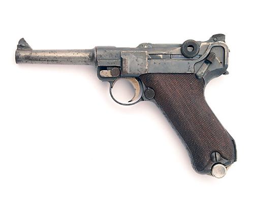 A 9mm (PARA) SEMI-AUTOMATIC SERVICE PISTOL SIGNED DWM, MODEL 'NAVY LUGER' serial no. 5317, dated for 1917, with shortened 4in. barrel, fore-sight re-attached, toggle retaining special sliding rear-sight graduated to 200m, frame with provision for shoulder-stock, chequered wood grips, all matching numbers except aluminium based magazine, in a homemade vinyl holster