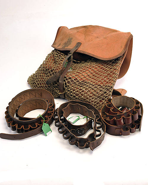 A BRADY GAME BAG TOGETHER WITH THREE CARTRIDGE BELTS, one of the cartridge belts with an Eley badge (4)